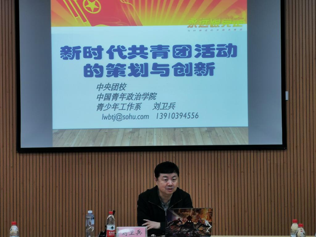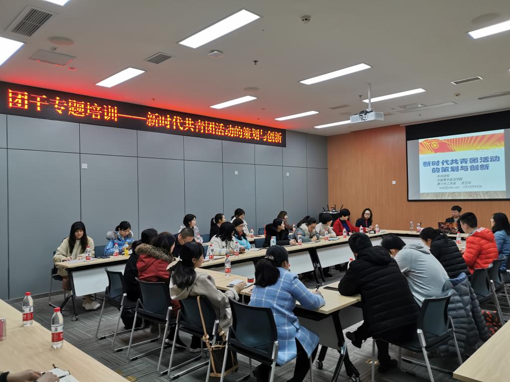 为深学笃用习近平新时代中国特色社会主义思想和学习贯彻党十九大精神,夯实“不忘初心、牢记使命”主题教育的思想基础和行动基础,巩固团务知识,建设一支积极向上、充满活力、坚强有力的团干队伍,做好青年学生“知心人”“热心人”“引路人”,12月5日下午,我校团委举办了团干专题培训,中央团校、中国青年政治学院刘卫兵教授做了《新时代共青团活动的策划与创新》,我校全体团干参与了此次培训。