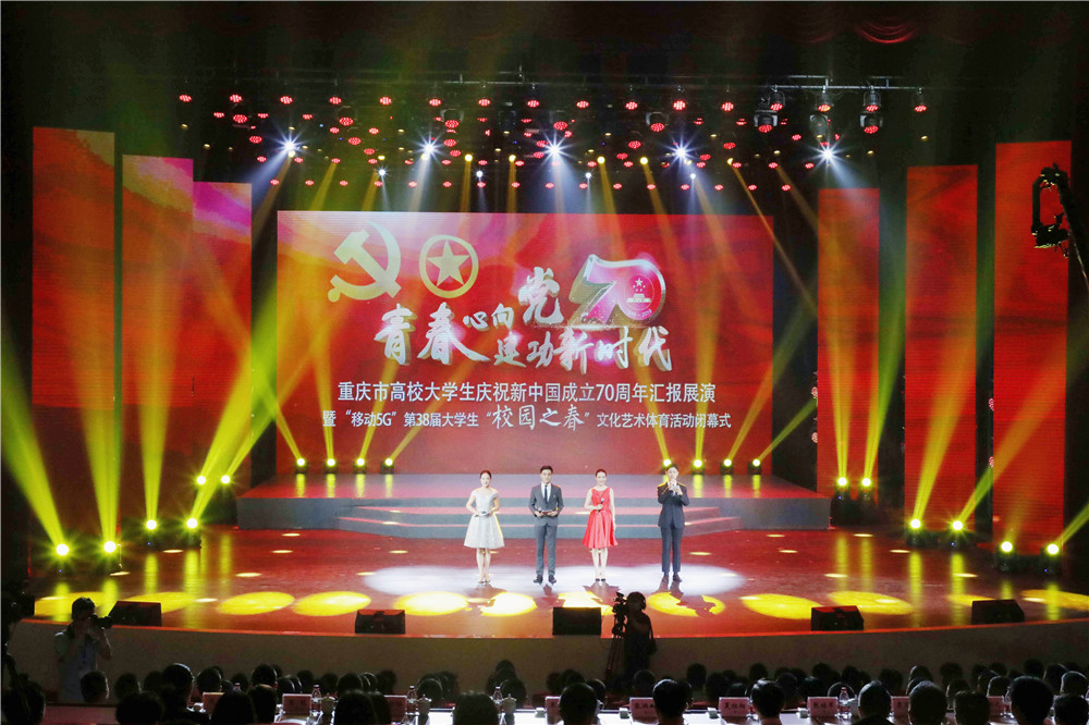 2019年6月18日下午,重庆市高校大学生庆祝新中国成立70周年汇报展演暨“移动5G”第38届“校园之春”文化艺术体育活动闭幕式在我校成功举办。一年一度重庆高校学子展现风采、施展才华的青春盛会圆满落下帷幕。市人大常委会副主任、党组成员,市总工会主席夏祖相、团市委书记张继军、市委宣传部副部长张洪斌、市委教育工委专职副书记覃正杰、团市委副书记叶力娜、团市委副书记谭涵之,万搏网页版_万搏(中国)官方在线登录党委书记李志雄、万搏网页版_万搏(中国)官方在线登录副校长李国军等相关部门及兄弟高校领导出席活动。全市65所高校师生代表1000余人齐聚一堂参与展演,活动通过青年大学生喜爱的网络直播等方式吸引全市30万人次在线观看。