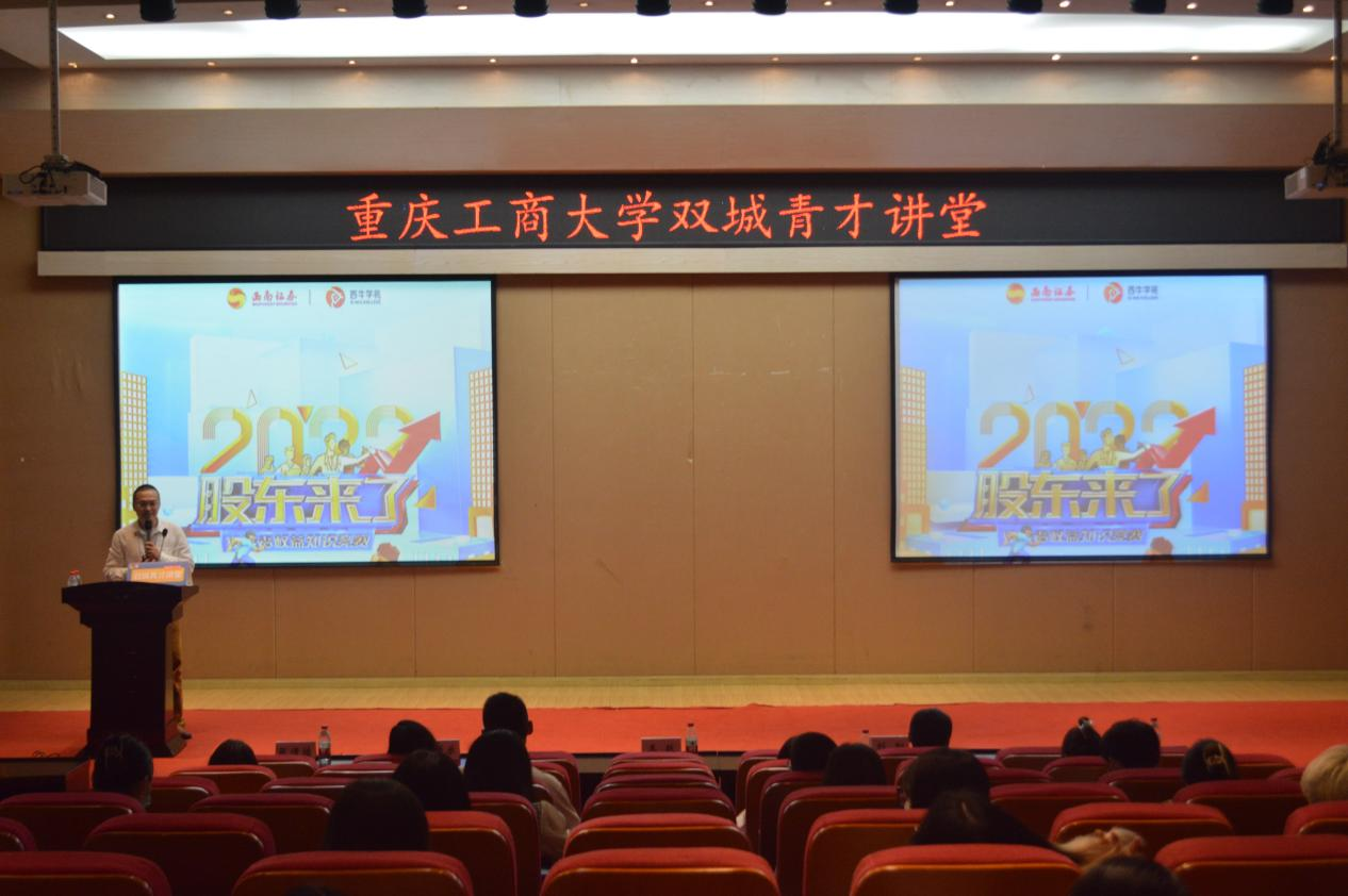 重庆市证券期货业协会秘书长王跃详细介绍了《股东来了》投资者权益知识竞赛,回顾了往届赛事开展情况,讲解了本届赛事的新特点及参赛方式等,鼓励同学们以赛促学、学赛结合,增加知识储备,提升专业技能。他还分享了重庆市证券期货业协会发展情况和主要职责,为学生求职就业和实习实践提出针对性建议。